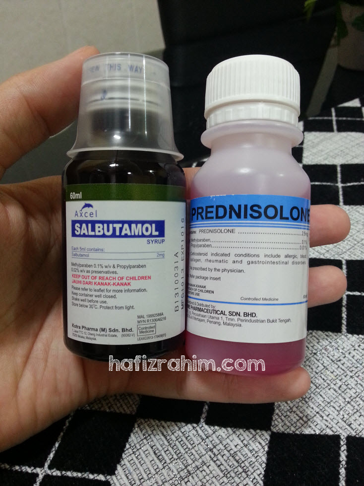 Hmm.. so, untuk check up tadi doktor dah bagi ubat Prednisolone dan Salbutamol (Ventolin). Dua-duanya jenis syrup. Katanya untuk mengurangkan simptom asma sekaligus melegakan rasa semput Khair.