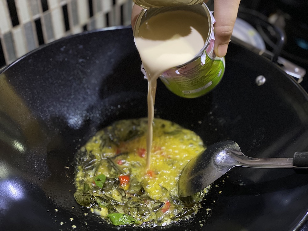 6. Masukkan 1 tin susu cair dan baki 4 kuning telur masin (hancurkan dulu). Kacau sehingga sebati.