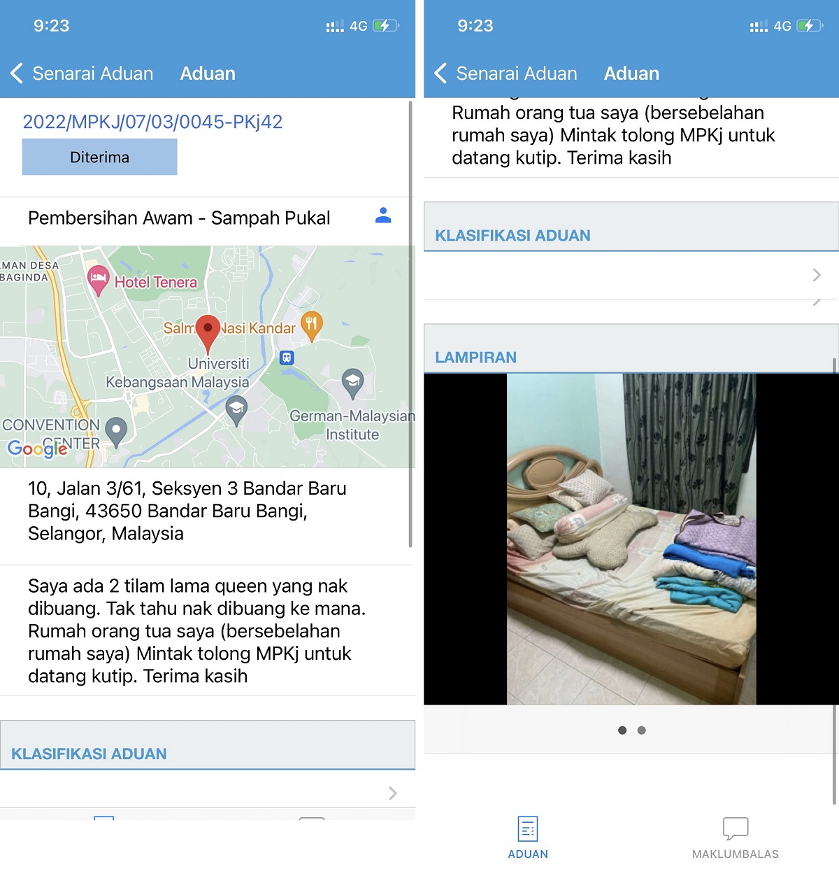 Aku terpinga-pinga kejap. Huh aduan sampah? Bila masa aku ada buat aduan kat Bangla? Blur sekejap tanpa teringatkan aduan yang aku pernah buat melalui apps iClean Selangor. Sehinggalah mamat bangla tu baca description aduan, baru lah aku teringat..