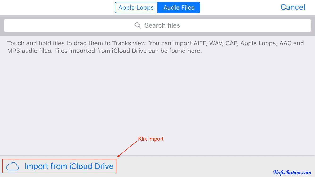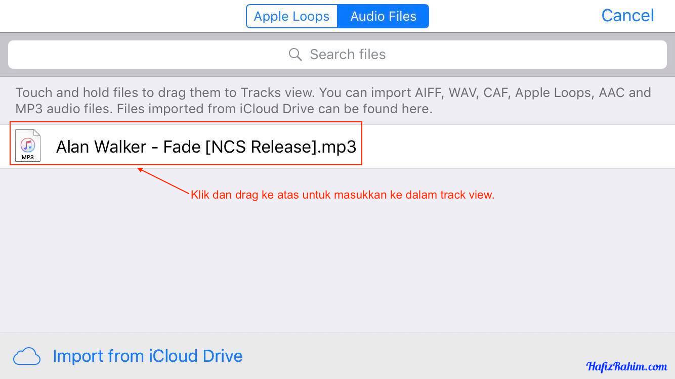 - Kotak senarai audio akan dipaparkan (sekiranya korang tak pernah create apa-apa lagu sebelum ini, tiada fail audio akan disenaraikan (seperti dalam gambar). Seterusnya, klik pada butang Import from iCloud Drive.