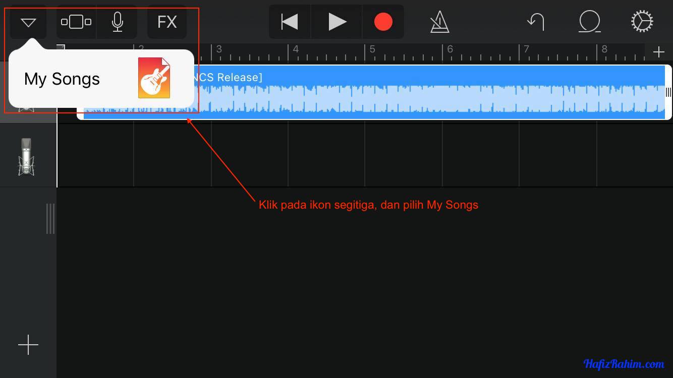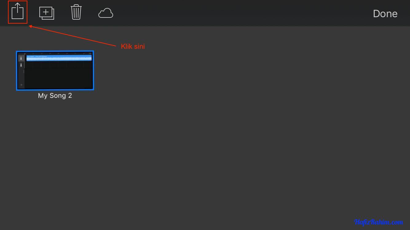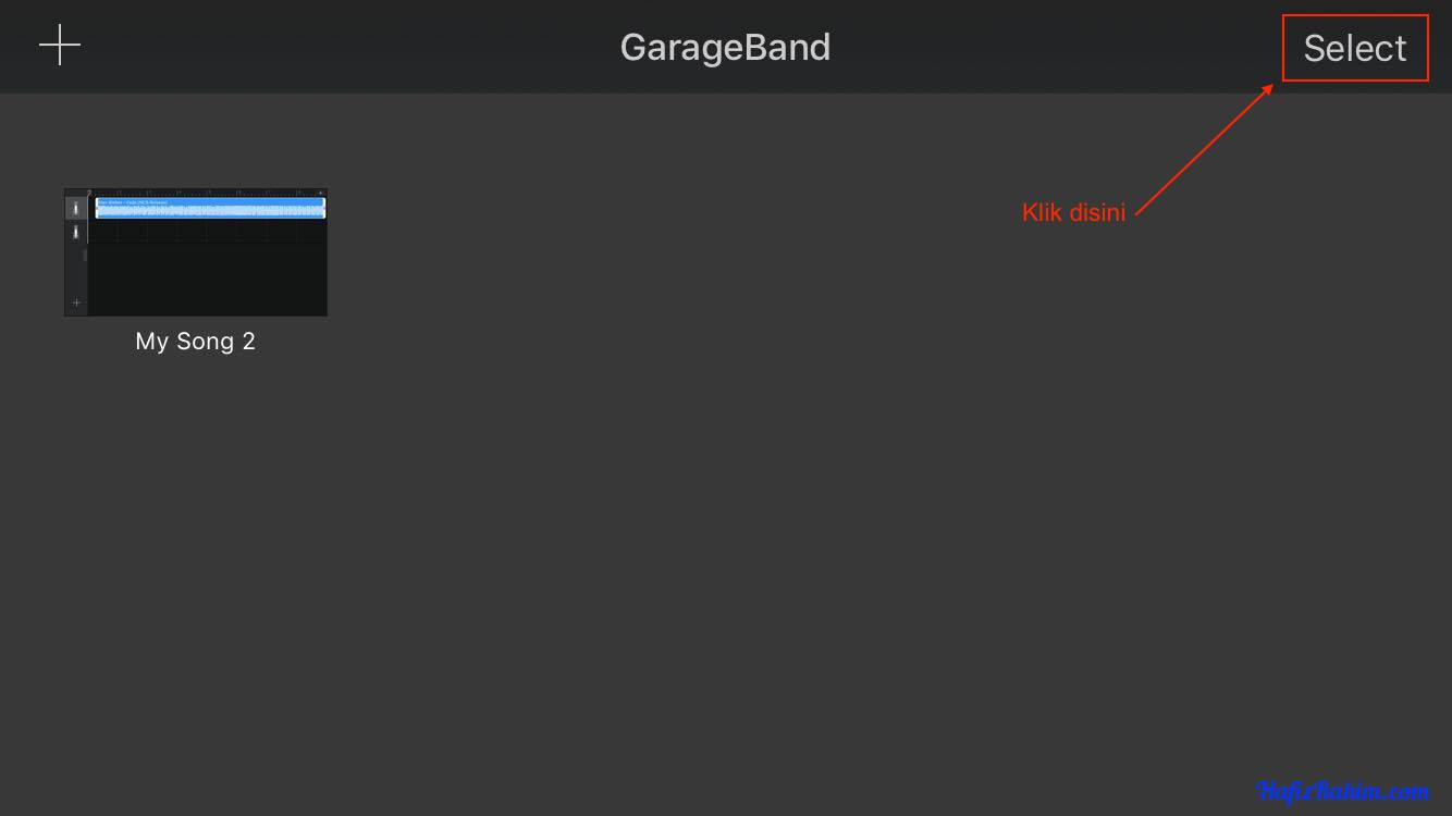 - Diruangan My Songs – GarageBand, lagu yang telah disunting akan dipaparkan. Seterusnya dibahagian atas kanan, klik pada Select.
