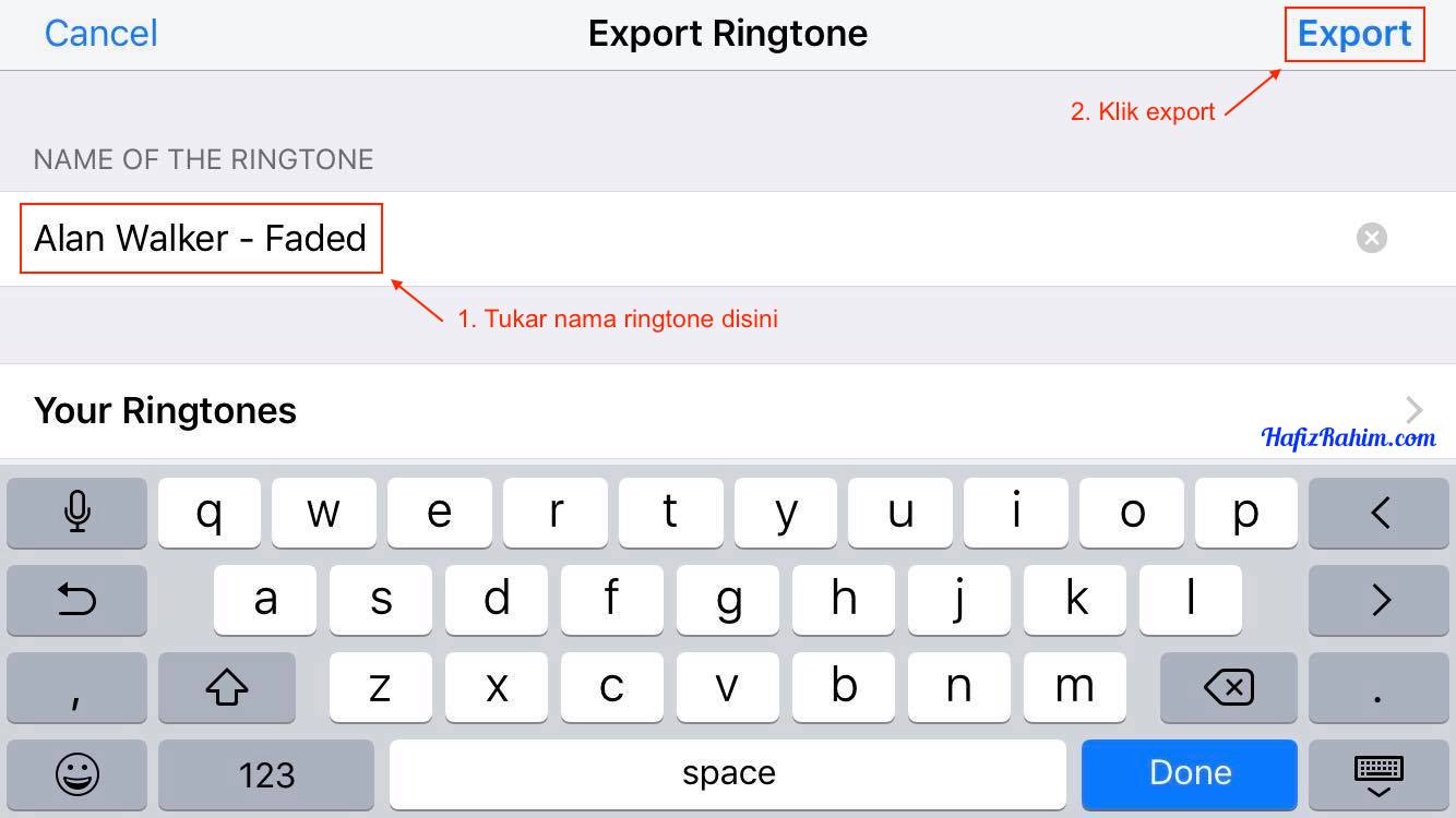 - Klik pada Ringtone, dan satu kotak export akan terhasil. Disini korang boleh menamakan ringtone korang dengan nama yang sesuai. Selesai menamakan ringtone korang, klik Export.