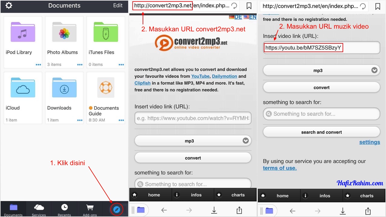- Pergi ke aplikasi Documents. Dibahagian bawah kanan, terdapat ikon web browser. Klik pada ikon tersebut, kemudian layari laman web convert2mp3.net. Paste-kan URL video yang korang dah copy tadi seterusnya klik Search and convert.