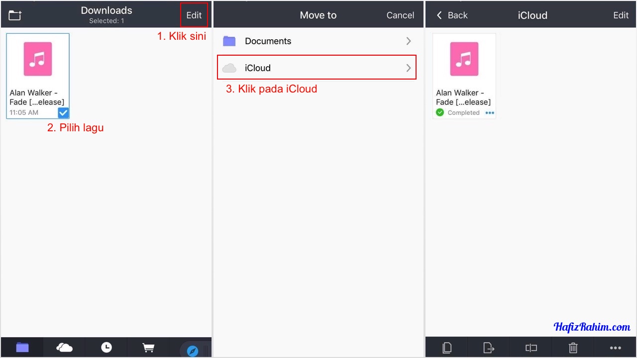 - Kemudian, didalam folder Documents/Downloads itu, klik pada Edit dibahagian atas kanan dan pilih lagu yang telah dimuat turun tadi. Move-kan ke dalam folder iCloud.