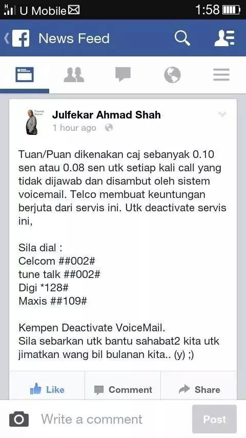 1. Maxis dan celcom tu jgn harap senang2 nk deactivate voicemail. Kauoranv kena call mereka atu pergi servis centre. Mmg diaorang sengaja nk menyusahkn pengguna. Sbb perkhidmatn voicemail tak guna ni yg bnyk bg keuntungan kt diaorang ats angin. Sistem kapitalis ala zionis begitula. Kejam dan keji. Yg penting, pulus masuk. Tukar je perkhidmatan lain cth tunetalk yg mmg senang nk deactivate. Gunakn kuasa pengguna. Kalau semua pakat boikot, nak tak nak diaorang terpaksalah ikut kehendak kita