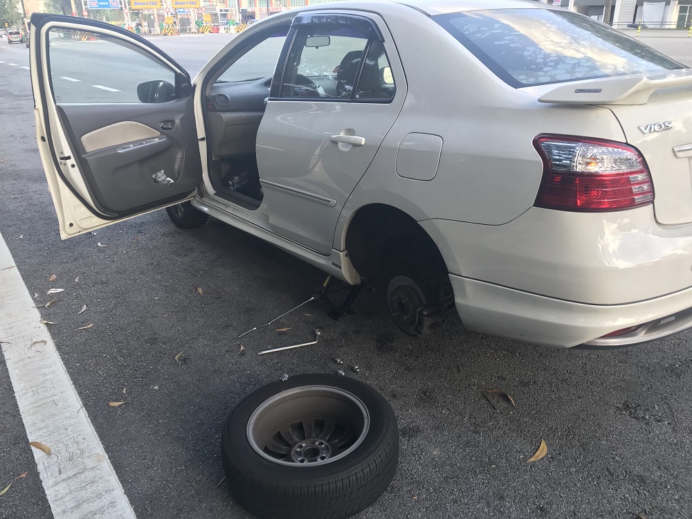Turun daripada kereta, bergegas tengok keadaan tayar..