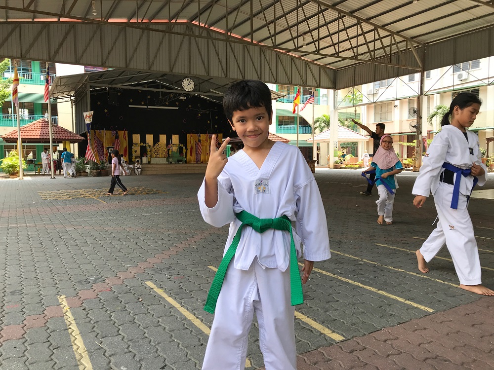 Bila nama dia disebut, laju bingkas bangun. Terus dipandangnya muka aku sambil senyum selebar-lebarnya. Yeay.. akhirnya benda yang dia tunggu-tunggu, dah dapat. Berjaya jugak dia naik ke tali pinggang hijau.