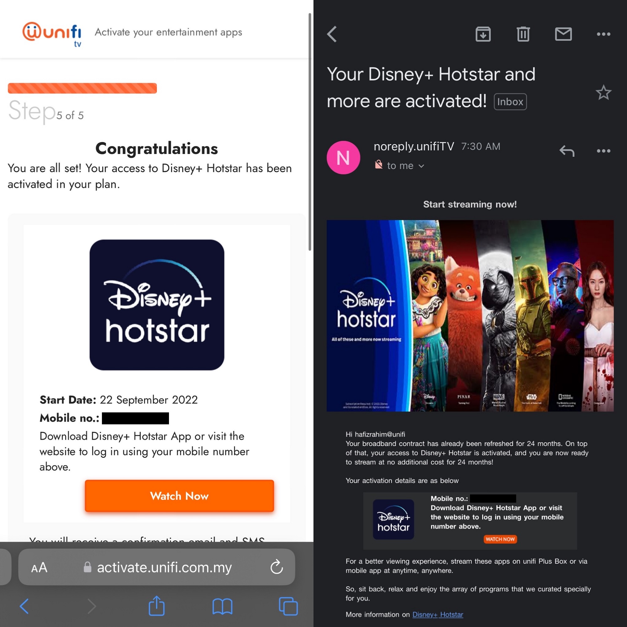 Selepas tempoh tersebut, aku akan dapat satu lagi SMS untuk mengaktifkan akaun dan sejurus diaktifkan, aku boleh terus mengakses Disney+ Hotstar secara percuma sama ada melalui handphone ataupun TV.