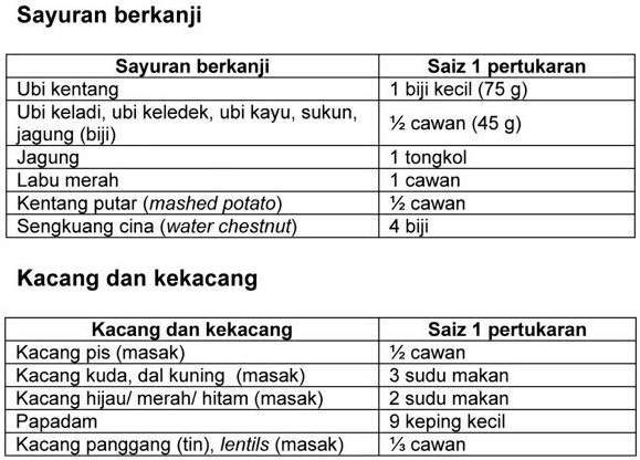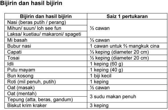 - Untuk snacking (minum pagi/minum ptg) boleh ambil 1-2 unit karbo. Contoh: 1-2 keping roti @ 3-6 keping biskut.