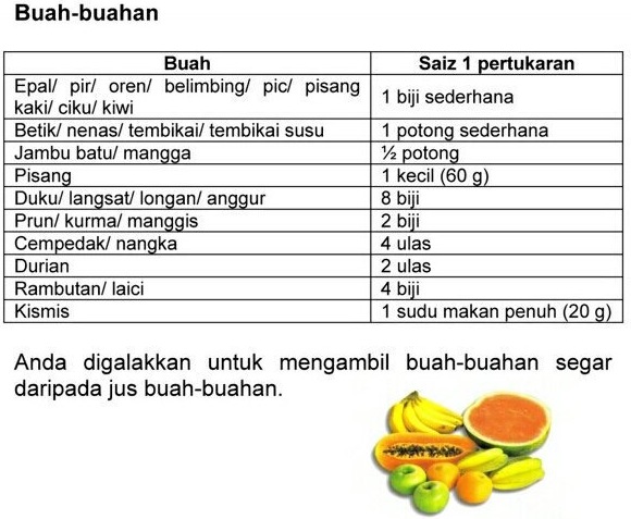 - Mitos: Betul ke pesakit diabetes boleh makan epal hijau je? SALAH! Pesakit boleh makan buah-buahan lain tapi kena control portion yang diambil. Disarankan sehari 2 unit buah-buahan (saiz hidangan seperti yang dikongsi diatas). Tapi perlu dimakan pada waktu berasingan kerana terdapat gula semulajadi (fructose) didalam buah. Apabila diambil dua unit sekali gus, dikhuatiri paras gula dalam darah cepat naik.