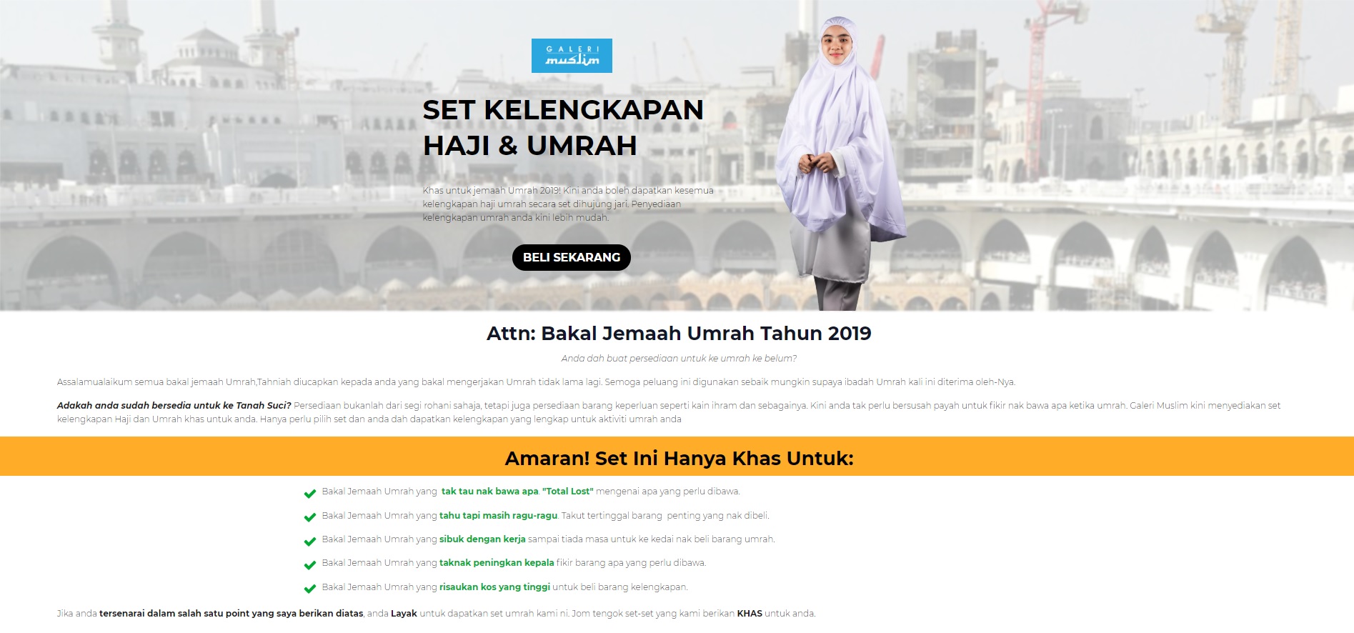 Melalui penawaran beberapa jenis set kelengkapan umrah yang dijual disini, Galeri Muslim bukan sahaja menawarkan penyelesaian masalah kepada bakal jemaah umrah yang langsung tak tahu nak bawa apa sebagai persediaan ke tanah suci, malah dalam masa yang sama juga membantu menyediakan barang-barang penting yang perlu dibawa.