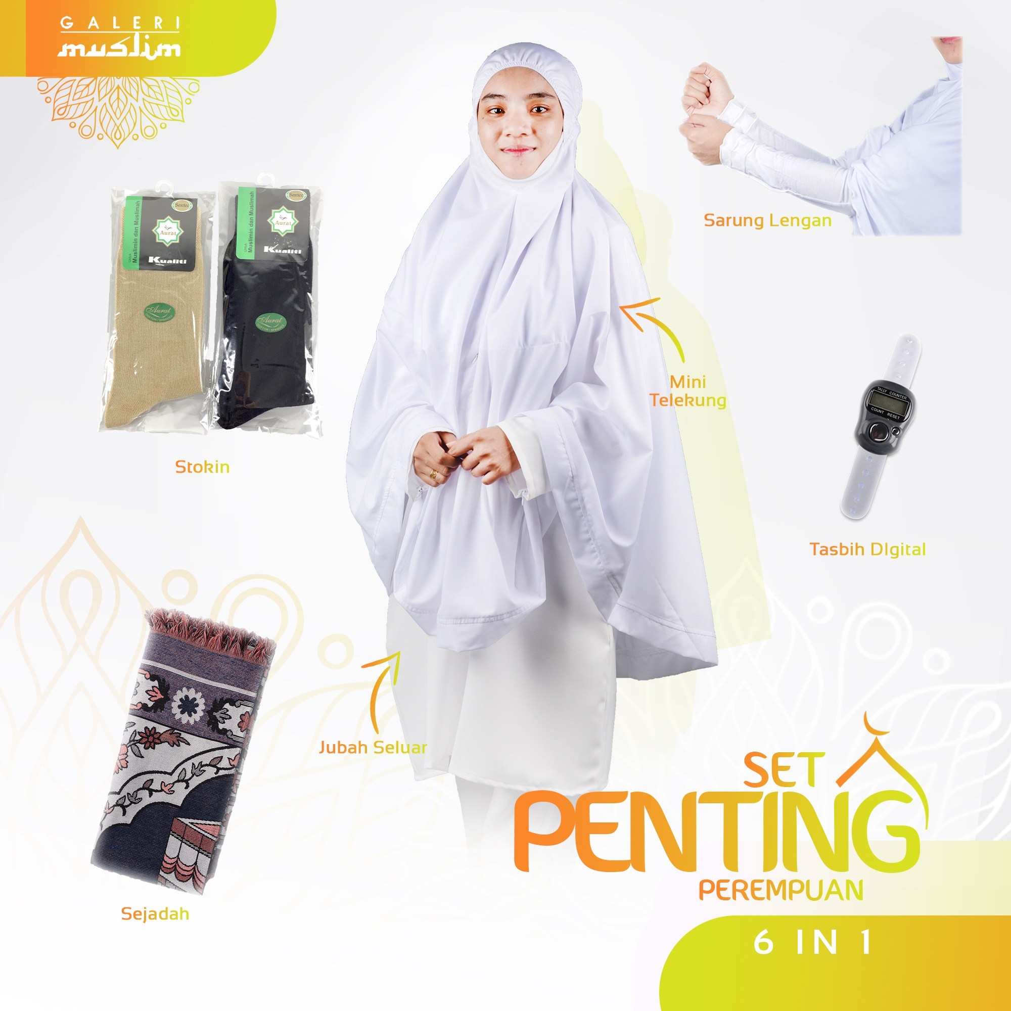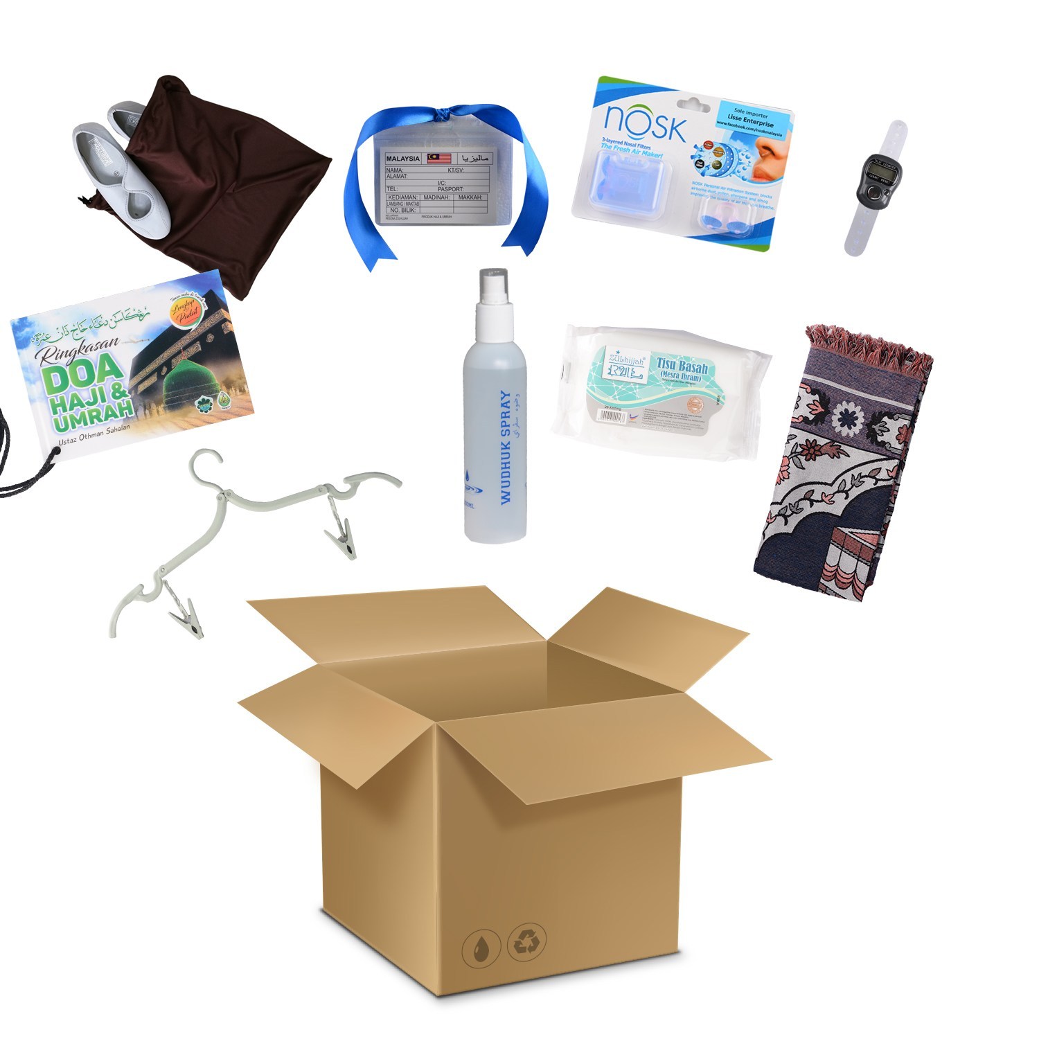 Set penting perempuan – dilengkapi dengan pakaian dan beberapa barangan asas yang wajib dibawa oleh jemaah perempuan seperti mini telekung, jubah seluar, sarung lengan, stokin wuduk, tasbih digital dan sejadah.