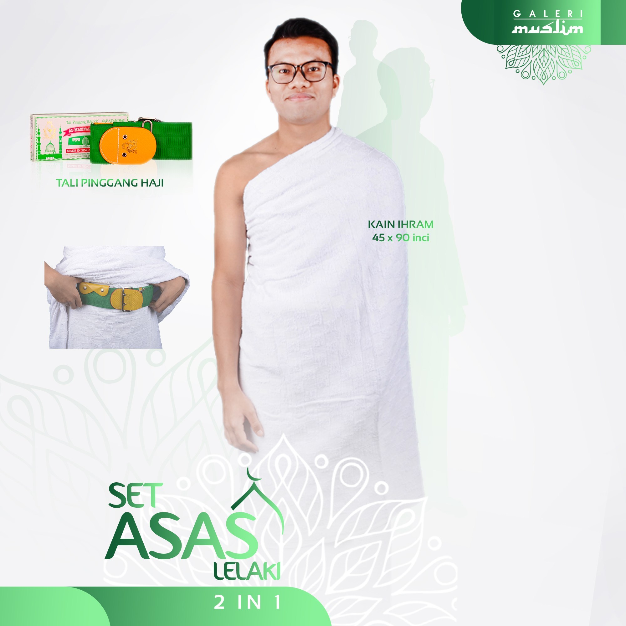 Set asas lelaki – mengandungi 2 keperluan pakaian asas yang wajib dibawa oleh jemaah lelaki ketika menunaikan umrah iaitu kain Ihram berukuran 45 x 90 inci dan juga tali pinggang haji.