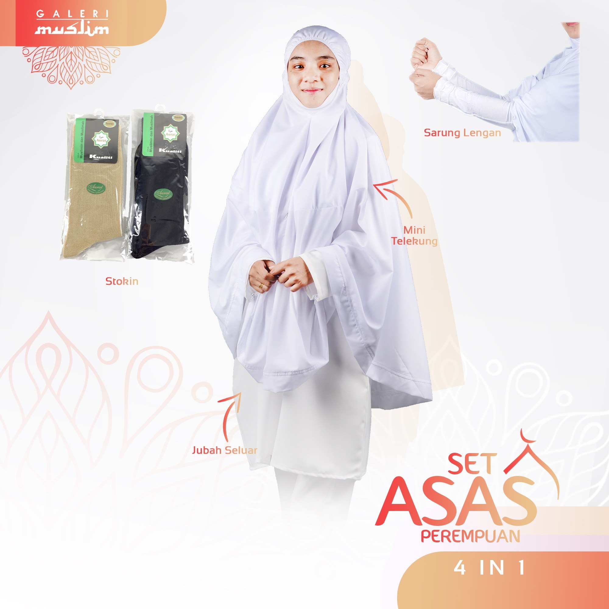 Set asas perempuan – mengandungi 4 keperluan pakaian asas yang wajib dibawa oleh jemaah perempuan ketika menunaikan umrah iaitu mini telekung, jubah seluar, sarung lengan dan stokin wuduk.