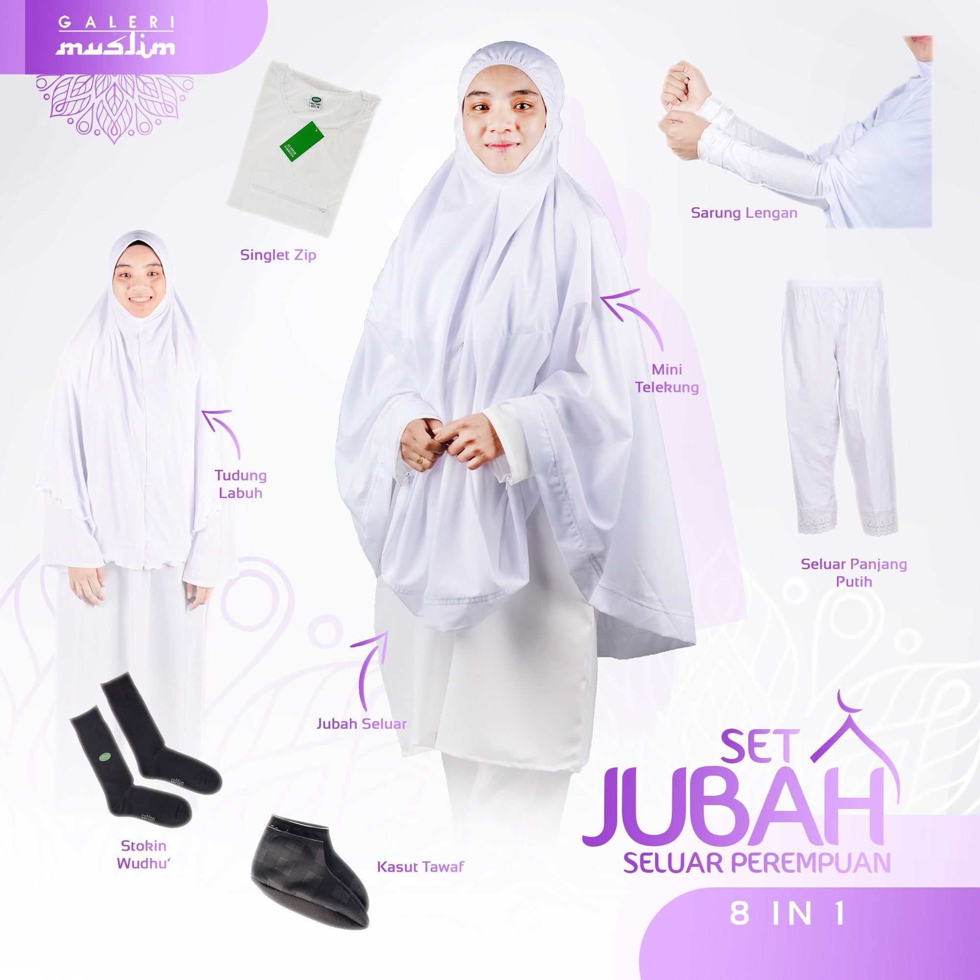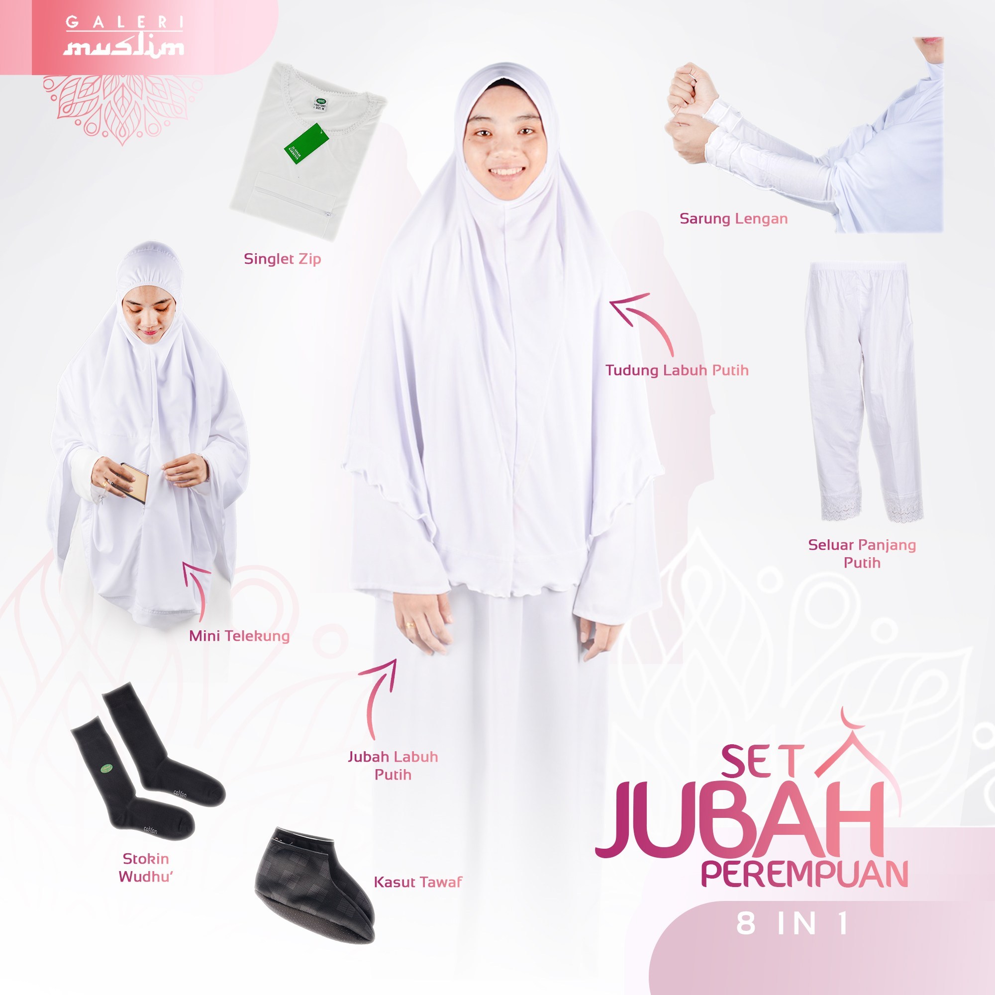 Set jubah perempuan – disarankan kepada jemaah perempuan yang ingin memakai jubah ketika menunaikan umrah, dimana ia dilengkapi dengan mini telekung, jubah labuh putih, singlet zip, seluar panjang putih, tudung labuh putih, sarung lengan, kasut tawaf dan stokin wuduk.