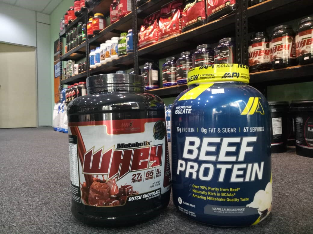 Contoh, belah kiri tu Whey protein dari MMX yang dibuat dari sumber susu dan tumbuhan. Belah kanan whey protein jenama API yang dibuat dari sumber susu dan daging lembu.
