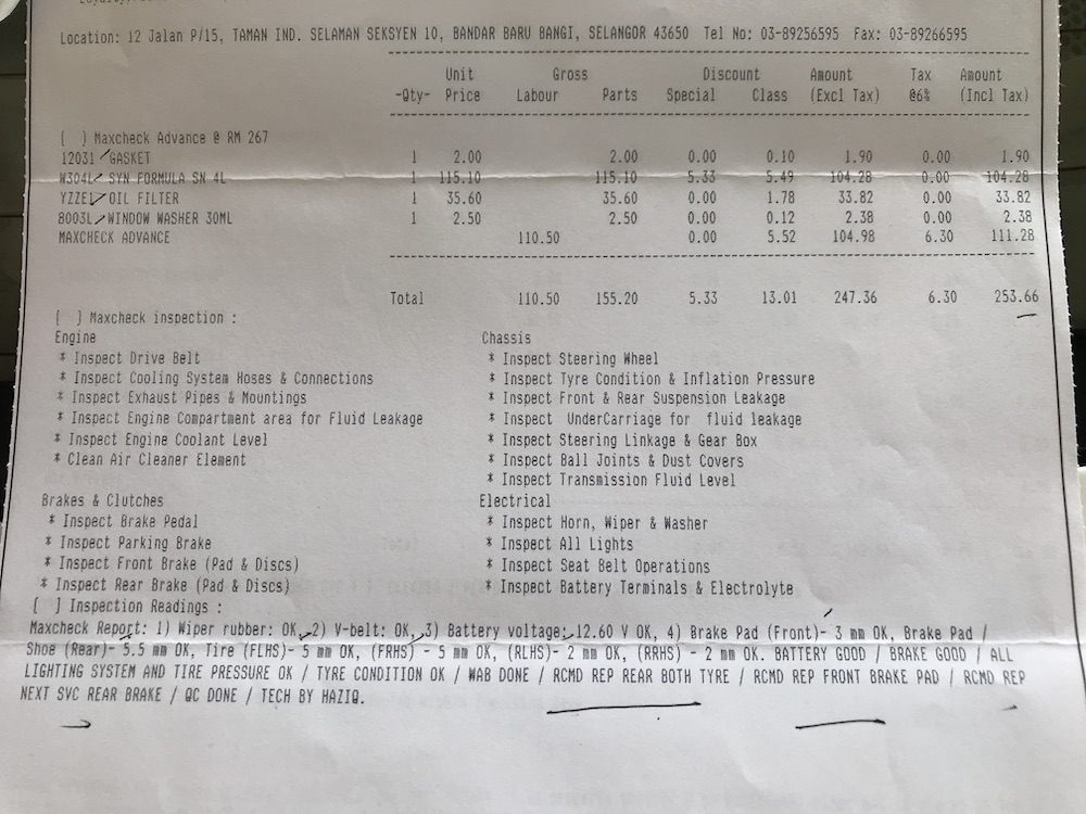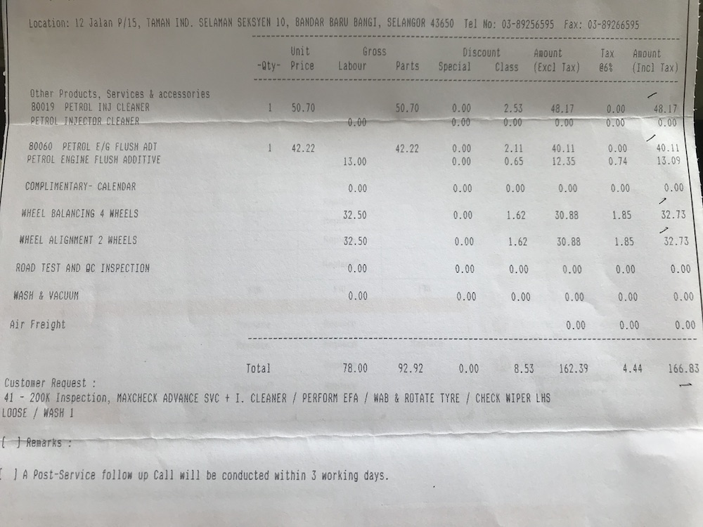 So, untuk servis kali ni masih melibatkan minor service sebab next major service aku adalah pada 240,000km. Dan total kos untuk minor service 210,000km ini adalah RM420+.