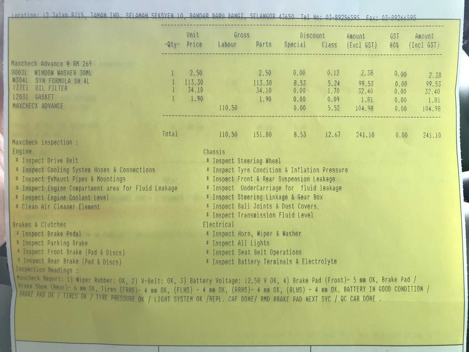 Dan untuk minor servis ini pula, tak banyak benda pun nak kena tukar. Cuma barang standard macam minyak hitam, fuel injector cleaner, cabin filter dan beberapa pemeriksaan Maxcheck Advance termasuklah periksa ketebalan brake pad dan tayar.