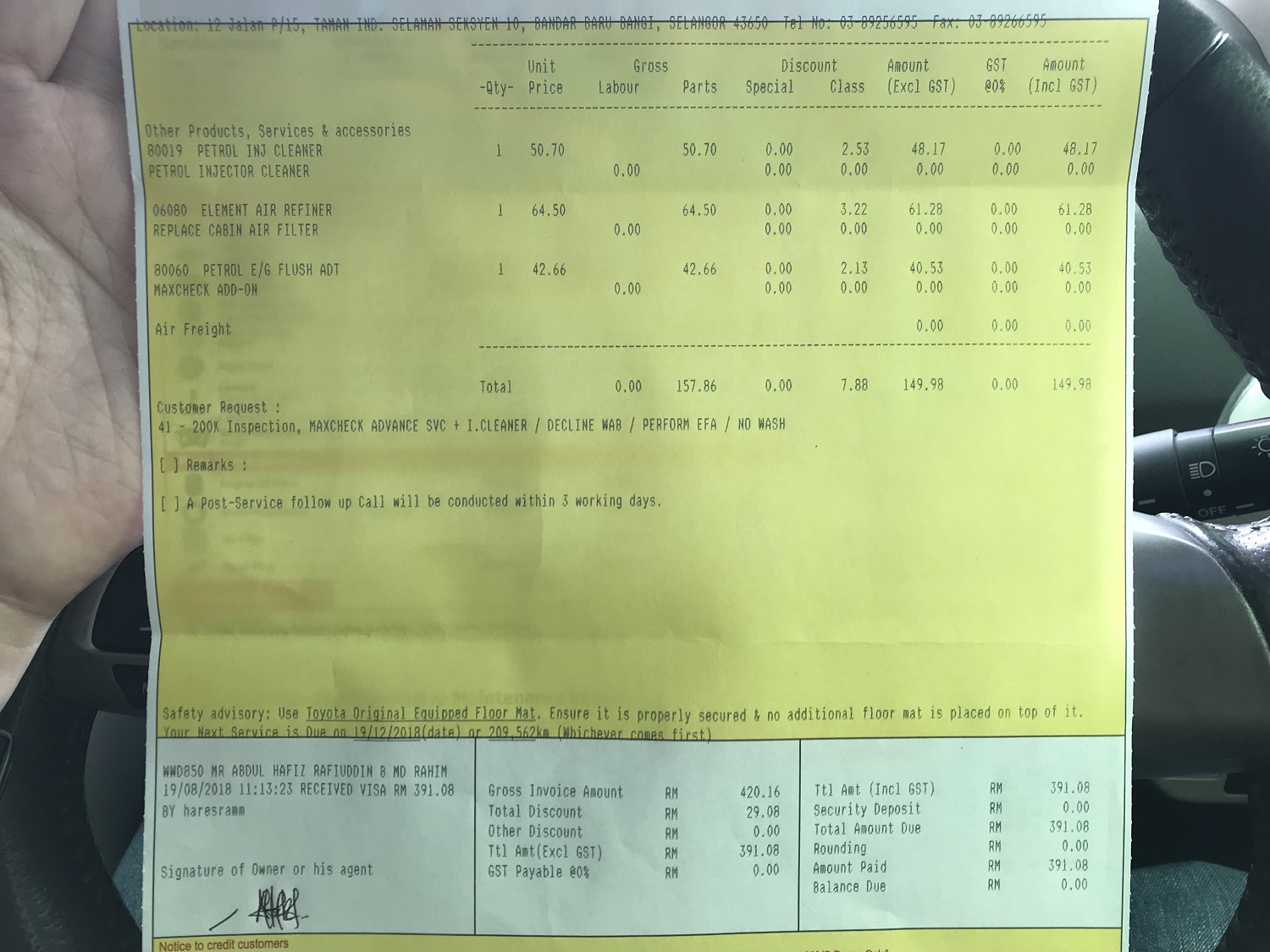 Quoted price untuk servis 200,000km ialah RM240+, tapi lepas siap semuanya.. actual price ialah RM390+.. sebab adanya tambahan fuel injector cleaner, engine flush dengan cabin air filter.