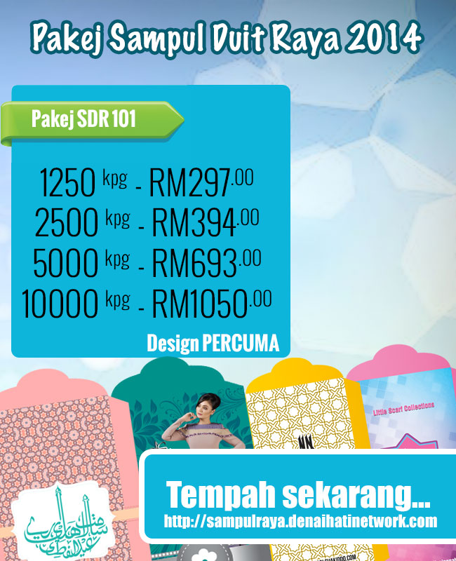 Ahh.. Itu anda tidak perlu risau kerana, dengan setiap tempahan mana-mana pakej.. Design sampul duit raya anda adalah PERCUMA. Just bagitahu saja design apa yang anda inginkan, insya-Allah pihak Denaihati Network akan cuba menunaikannya.