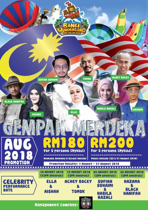 - Share atau repost video di bawah ini dengan caption “Saya nak bersantai Gempak Merdeka bersama (Nama Artis – rujuk senarai dibawah) di Bangi Wonderland!”